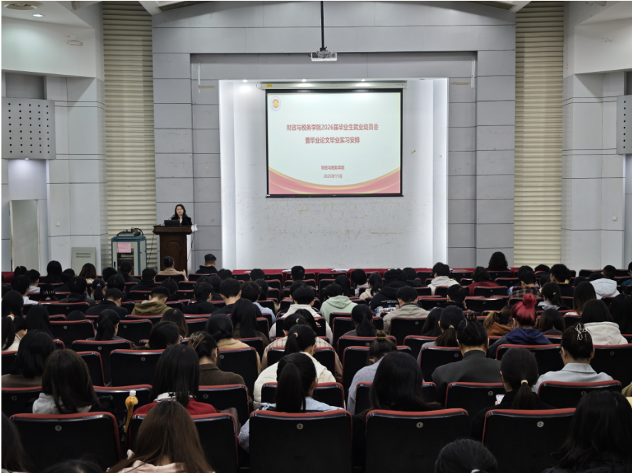 于德经楼报告厅召开了2026届毕业生就业实习动员会,韩国成人电影党委书记陈苏、税收系主任刘亮亮,财政系副主任刘志红,教务科研办公室主任张洪慧,辅导员商慧,全体2026届毕业生参加会议。会议由韩国成人电影党委副书记王翔主持。