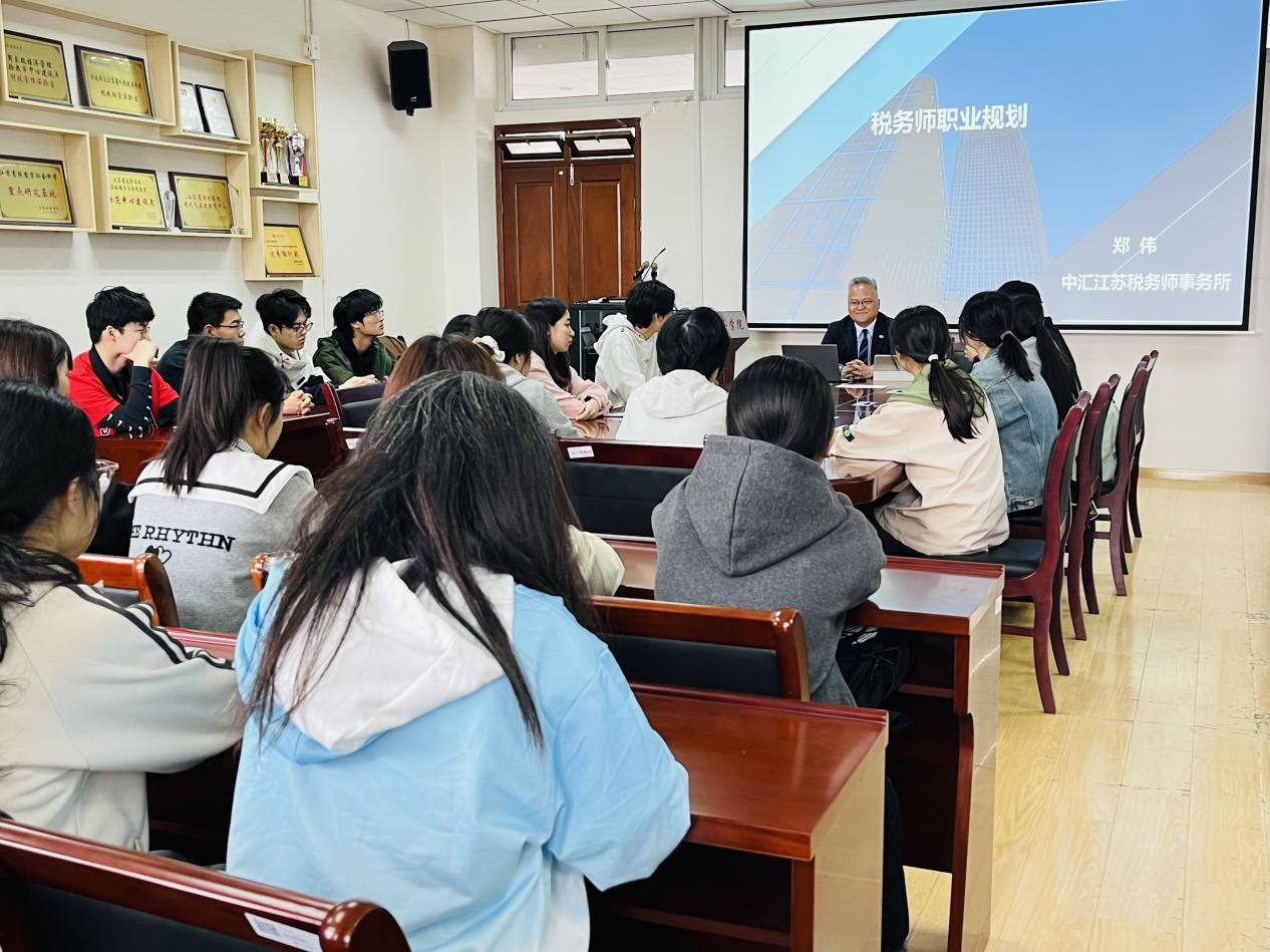 在经验分享环节,郑总以学长身份回忆了自己当年报考税务师时的学习经历,并与同学们分享了多年来的职场感悟。他建议同学们在校期间不仅要构建完整的专业知识体系,更要培养敏锐的逻辑思维与实务意识。郑总用平实的话语,将复杂的职业规划拆解为“打好底色、选对赛道、稳步积累”的务实路径,为在场学子开启了职涯规划的第一步,令大家深受启发。
